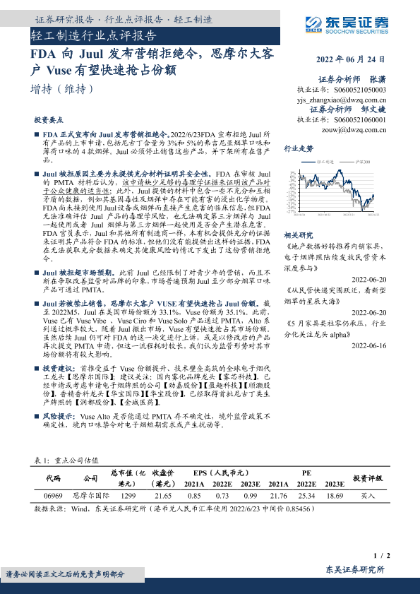 【东吴证券】【20220624】FDA向Juul发布营销拒绝令,思摩尔大客户Vuse有望快速抢占份额-2页