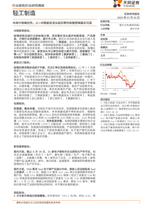 【天风证券】【20220703】轻工制造:布局中报确定性,2C+内销家居龙头疫后率先恢复逻辑基本兑现-19页