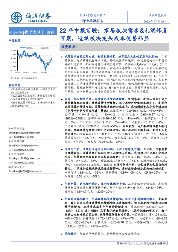 【海通证券】【20220706】22年中报前瞻:家居板块需求&利润修复可期,造纸板块龙头成本优势凸显-5页