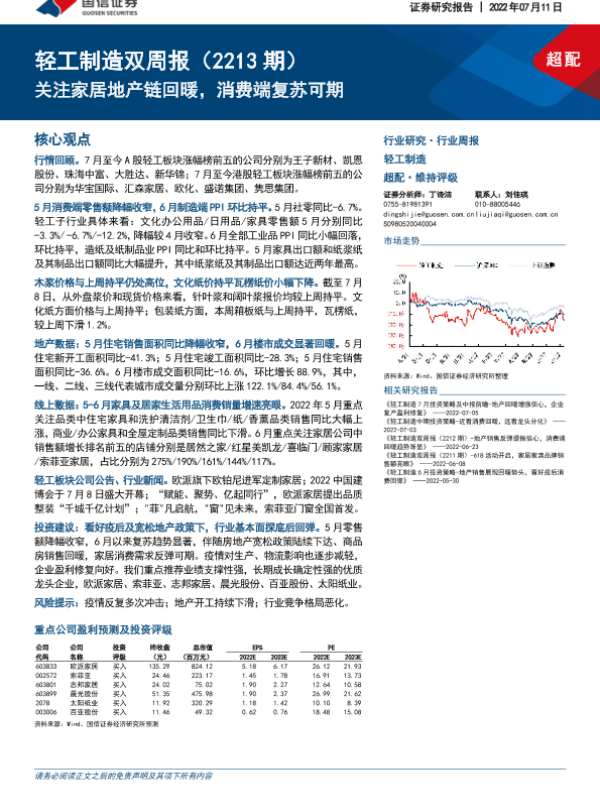 【国信证券】【20220711】轻工制造双周报(2213期):关注家居地产链回暖,消费端复苏可期-18页