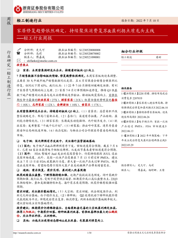 【浙商证券】【20220710】20220710-浙商证券-轻工行业周报:家居修复趋势依然确定,持续聚焦消费复苏&盈利拐点质龙头主线-30页