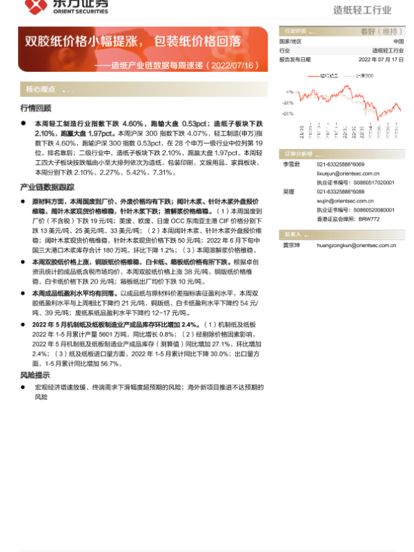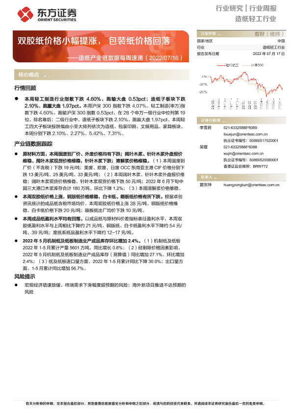 【东方证券】【20220717】20220717-东方证券-造纸产业链数据每周速递:双胶纸价格小幅提涨,包装纸价格回落-13页