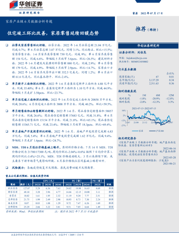【华创证券】【20220717】家居产业链6月数据分析专题:住宅竣工环比改善,家居零售延续回暖态势-13页