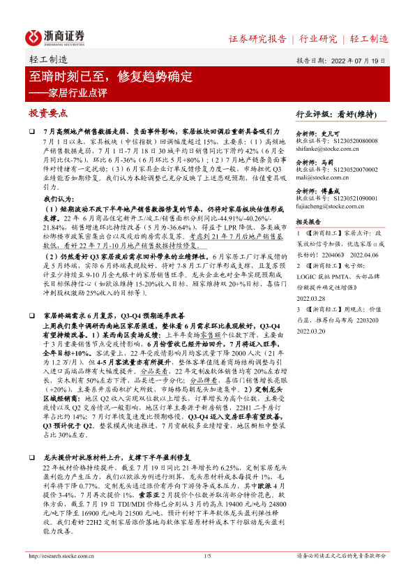【浙商证券】【20220719】20220719-浙商证券-家居行业点评:至暗时刻已至,修复趋势确定-5页