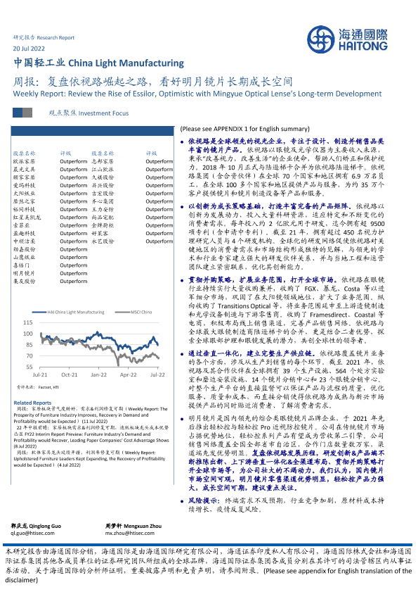 【海通国际】【20220720】中国轻工业周报:复盘依视路崛起之路,看好明月镜片长期成长空间-22页