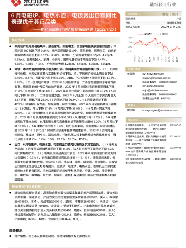 【东方证券】【20220723】20220723-东方证券-造纸轻工行业周报:地产后周期产业链数据每周速递-6月电磁炉、电热水壶、电饭煲出口额同比表现优于其它品类-14页