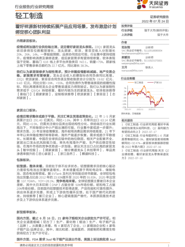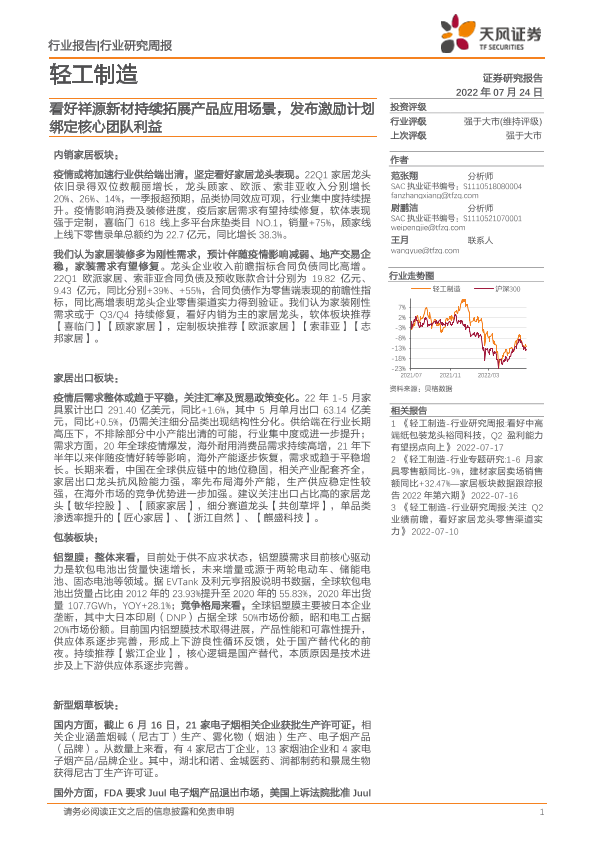 【天风证券】【20220724】轻工制造行业研究周报:看好祥源新材持续拓展产品应用场景,发布激励计划绑定核心团队利益-20页