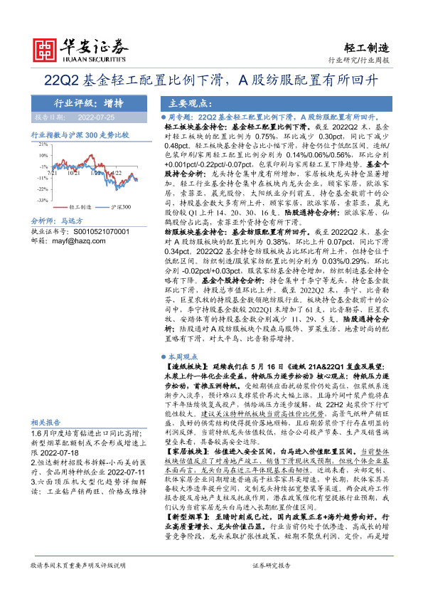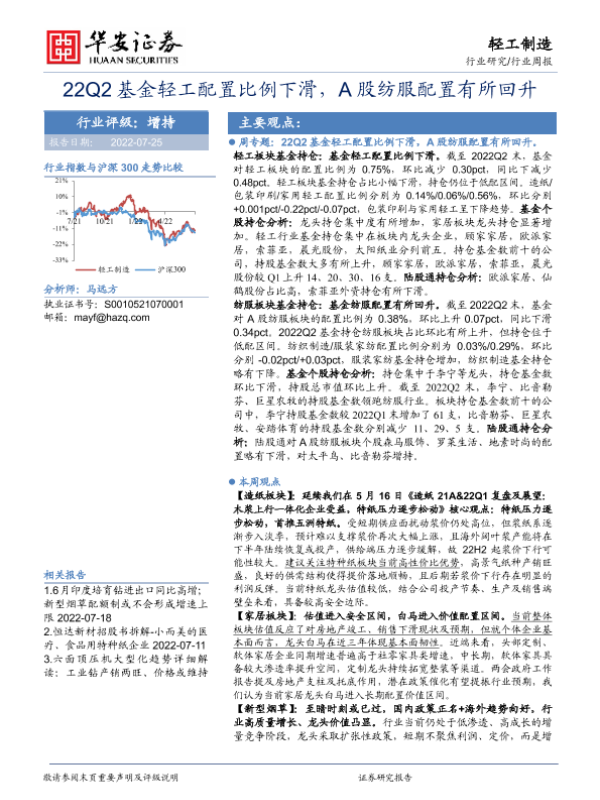 【华安证券】【20220725】22Q2基金轻工配置比例下滑,A股纺服配置有所回升-20页