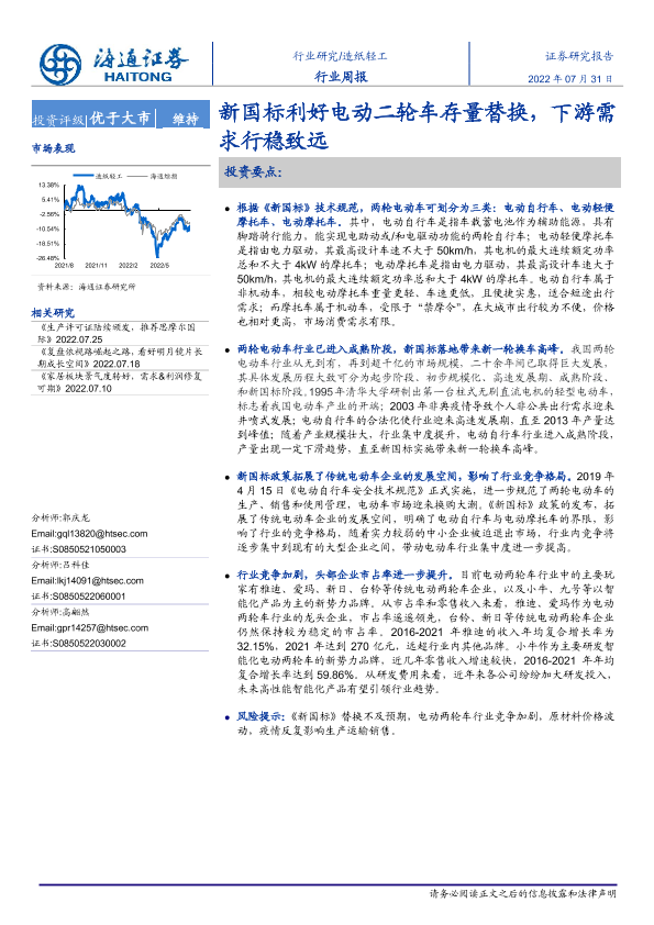 【海通证券】【20220731】20220731-海通证券-造纸轻工行业周报:新国标利好电动二轮车存量替换,下游需求行稳致远-12页