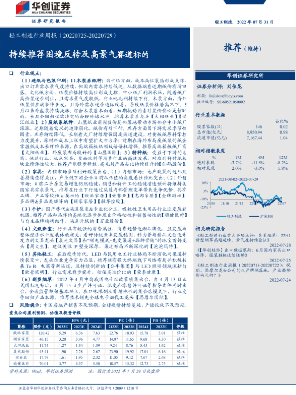 【华创证券】【20220731】20220731-华创证券-轻工制造行业周报:持续推荐困境反转及高景气赛道标的-15页