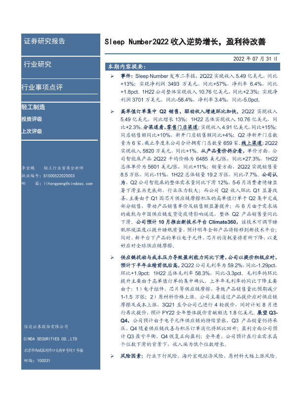 【信达证券】【20220731】Sleep Number2Q22收入逆势增长,盈利待改善-3页