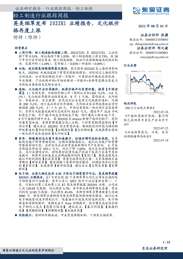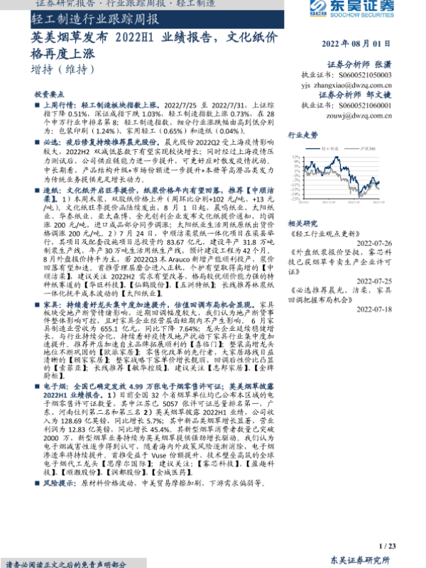 【东吴证券】【20220801】轻工制造行业跟踪周报:英美烟草发布2022H1业绩报告,文化纸价格再度上涨-23页