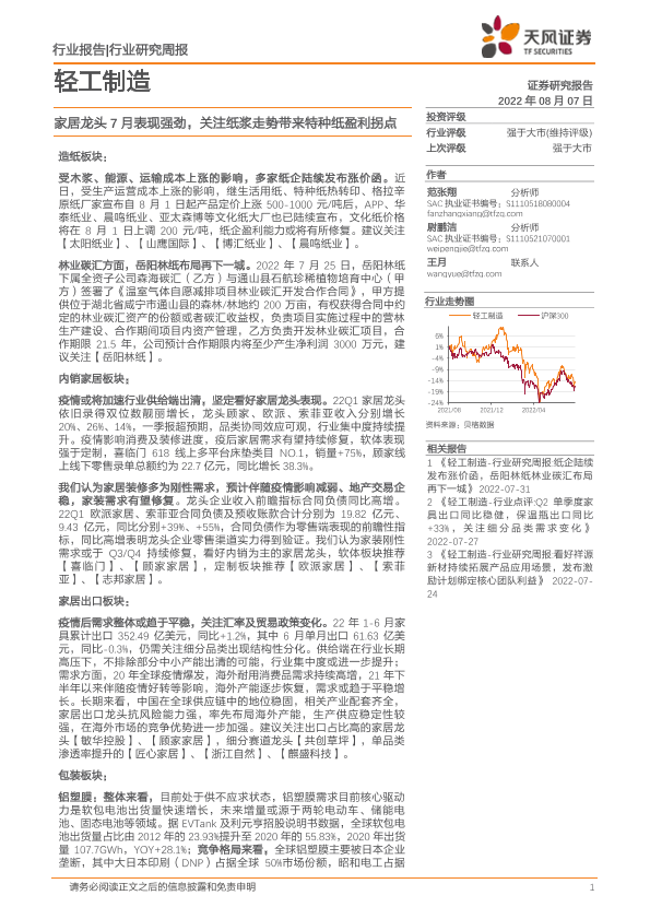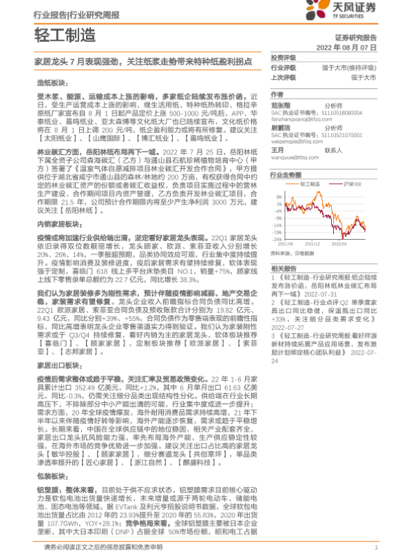 【天风证券】【20220807】轻工制造行业研究周:家居龙头7月表现强劲,关注纸浆走势带来特种纸盈利拐点-19页