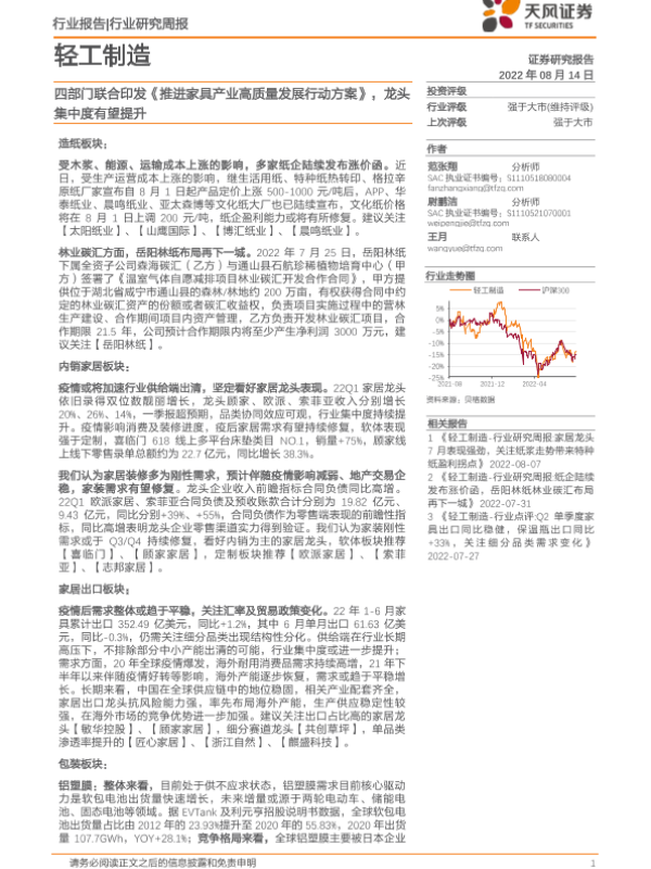 【天风证券】【20220814】轻工制造行业研究周报:四部门联合印发《推进家具产业高质量发展行动方案》,龙头集中度有望提升-19页