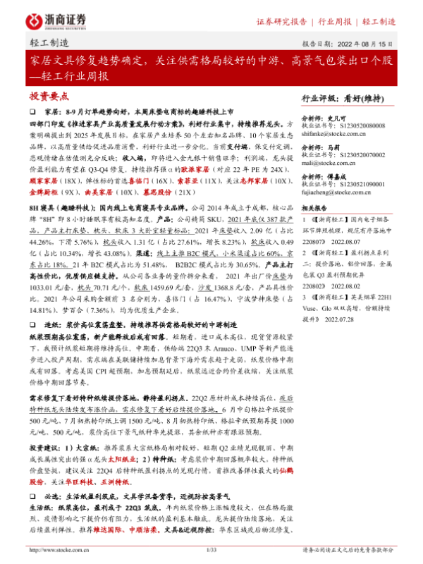 【浙商证券】【20220815】20220815-浙商证券-轻工行业周报:家居文具修复趋势确定,关注供需格局较好的中游、高景气包装出口个股-33页