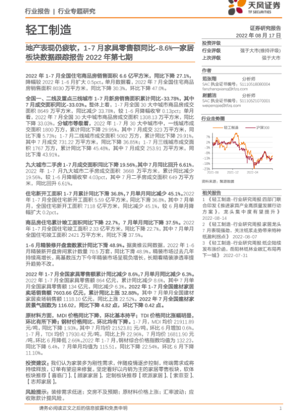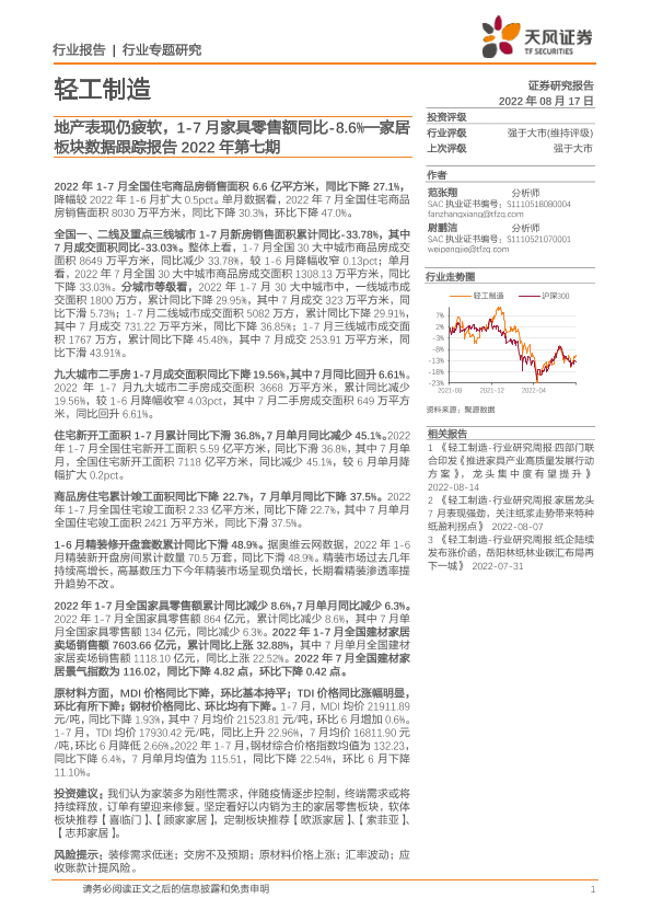 【天风证券】【20220817】家居板块数据跟踪报告2022年第七期:地产表现仍疲软,1-7月家具零售额同比-8.6%-13页