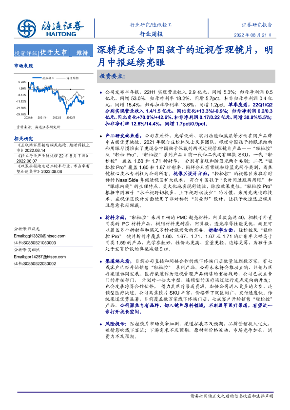 【海通证券】【20220821】20220821-海通证券-造纸轻工行业周报:深耕更适合中国孩子的近视管理镜片,明月中报延续亮眼-12页