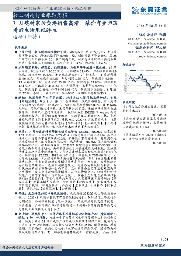 【东吴证券】【20220822】轻工制造行业跟踪周报:7月建材家居卖场销售高增,浆价有望回落看好生活用纸弹性-21页