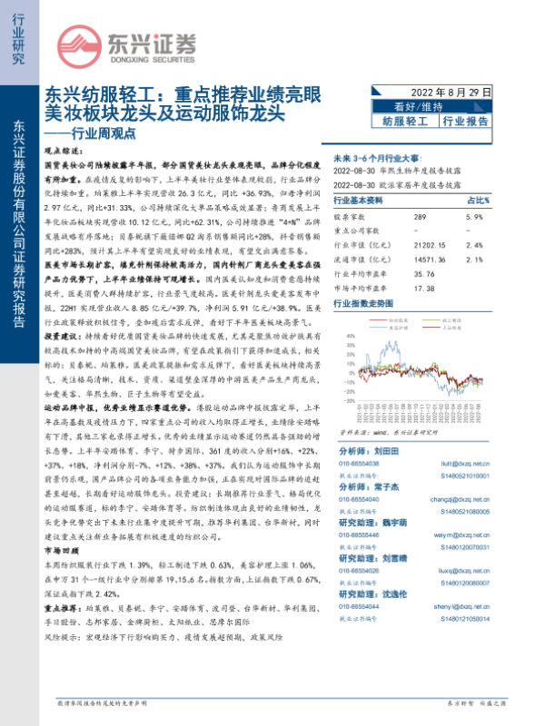 【东兴证券】【20220829】东兴纺服轻工:重点推荐业绩亮眼美妆板块龙头及运动服饰龙头-15页