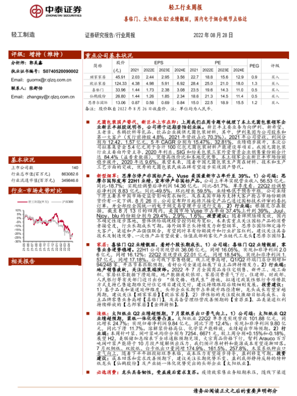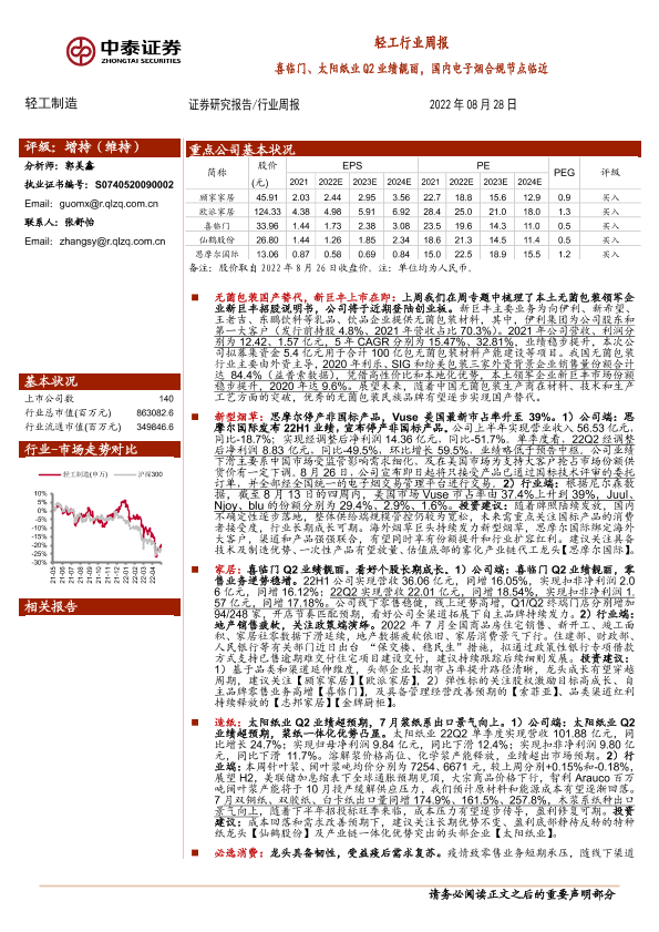 【中泰证券】【20220828】轻工行业周报:喜临门、太阳纸业Q2业绩靓丽,国内电子烟合规节点临近-14页