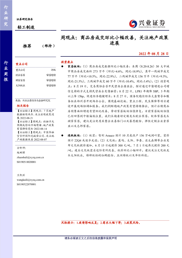 【兴业证券】【20220828】20220828-兴业证券-轻工制造周观点:商品房成交环比小幅改善,关注地产政策进展-23页