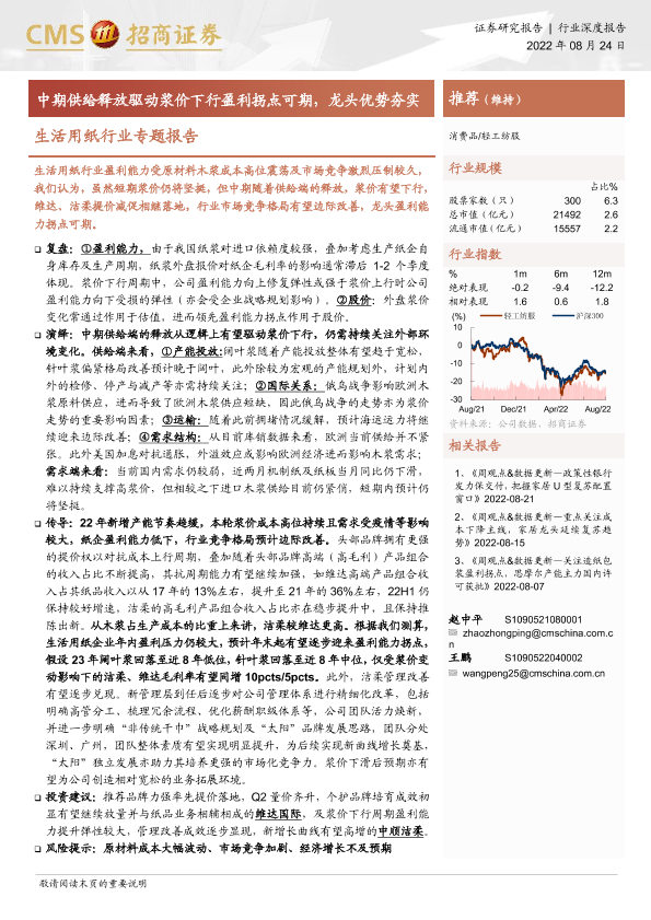 【海通证券】【20220824】生活用纸行业专题报告:中期供给释放驱动浆价下行盈利拐点可期,龙头优势夯实-10页