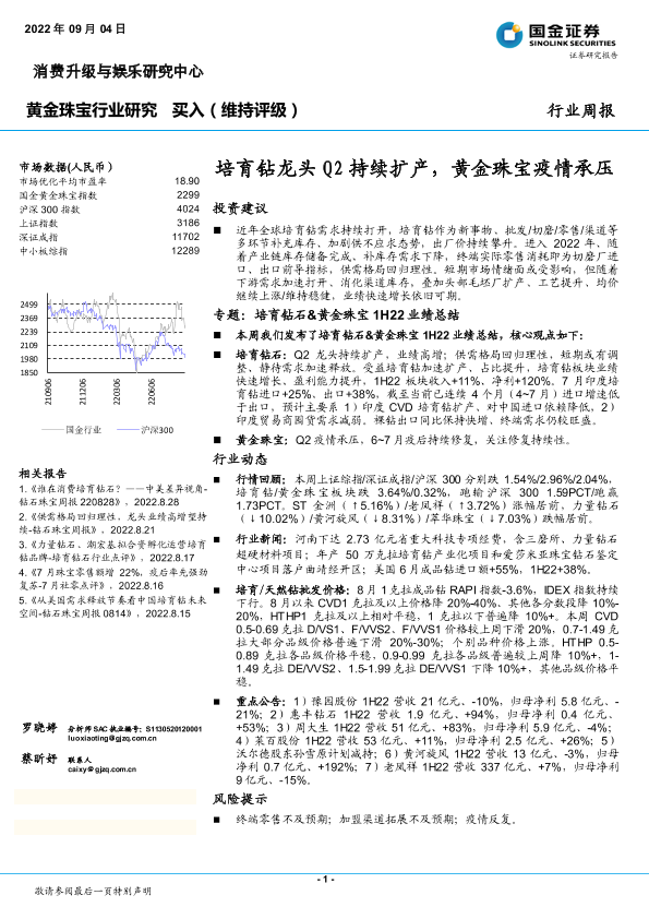 【国金证券】【20220904】20220904-国金证券-黄金珠宝行业研究:培育钻龙头Q2持续扩产,黄金珠宝疫情承压-19页