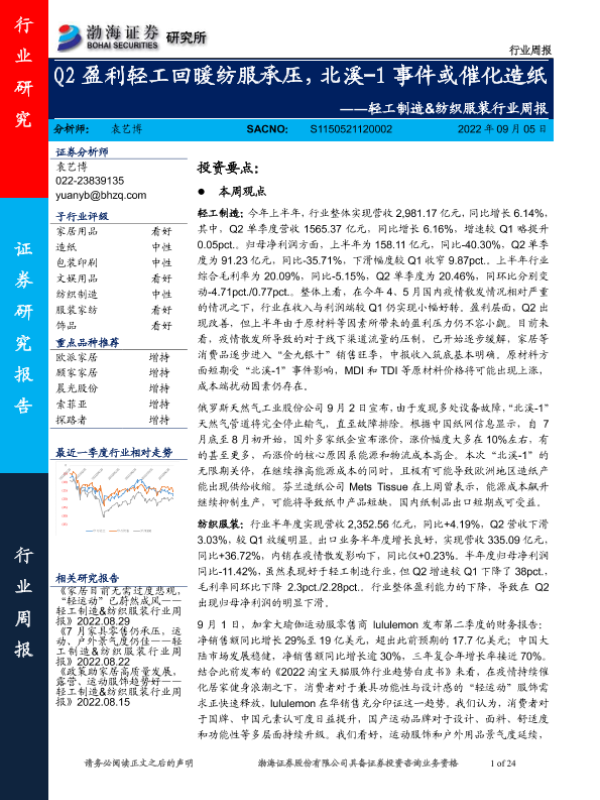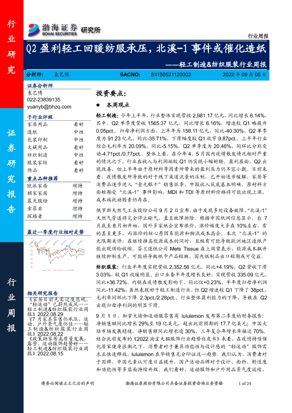 【渤海证券】【20220905】20220905-渤海证券-轻工制造&纺织服装行业周报:Q2盈利轻工回暖纺服承压,北溪-1事件或催化造纸-24页