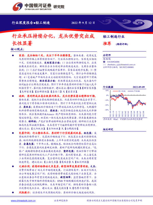 【银河证券】【20220912】20220912-中国银河-轻工制造行业深度报告:行业承压持续分化,龙头优势突出成长性显著-29页