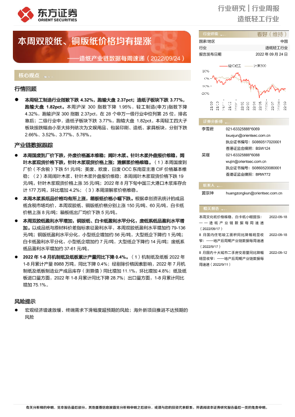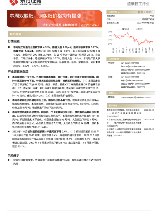 【东方证券】【20220924】20220924-东方证券-造纸产业链数据每周速递:本周双胶纸、铜版纸价格均有提涨-13页