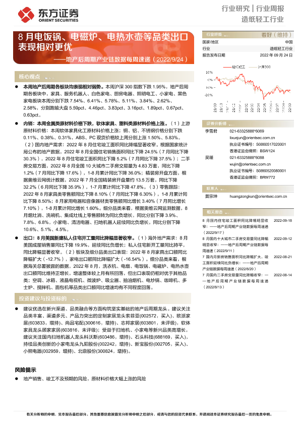 【东方证券】【20220924】20220924-东方证券-造纸轻工行业:地产后周期产业链数据每周速递:8月电饭锅、电磁炉、电热水壶等品类出口表现相对更优-14页