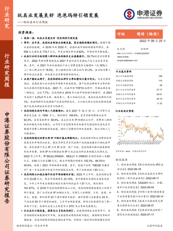 【申港证券】【20220925】20220925-申港证券-轻纺美妆行业周报:玩具业发展良好 泡泡玛特引领发展-16页