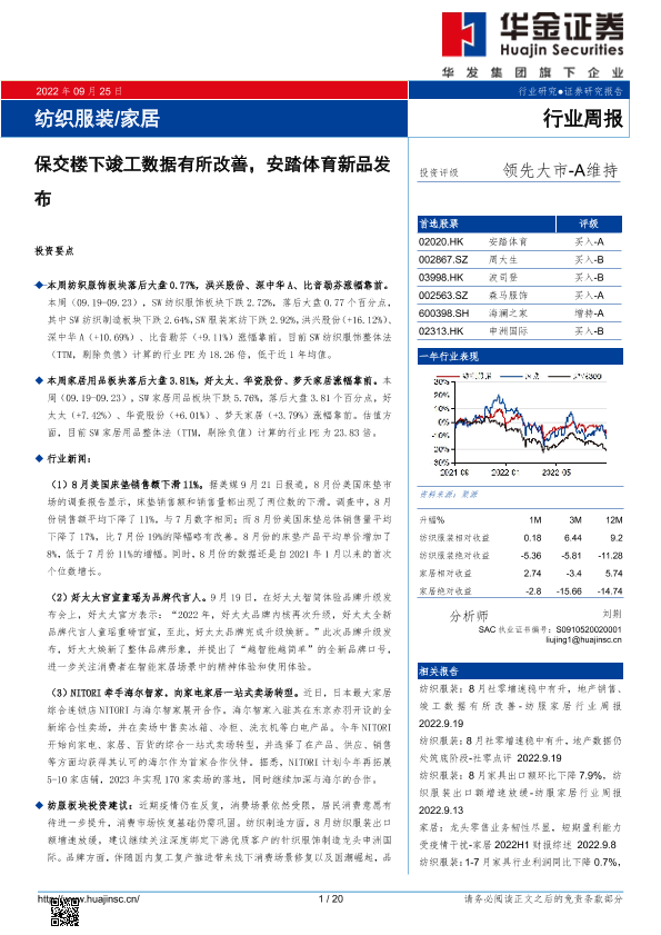 【华金证券】【20220926】保交楼下竣工数据有所改善,安踏体育新品发布-20页