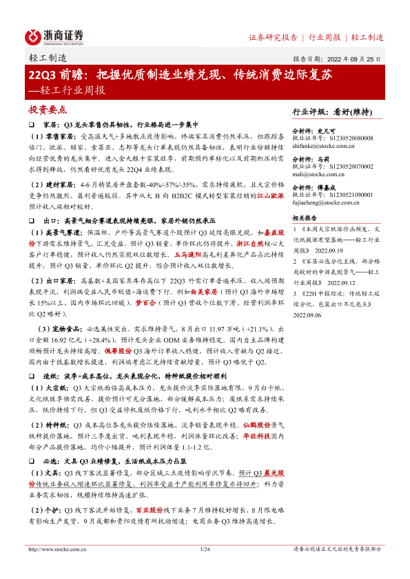 【浙商证券】【20220925】22Q3前瞻:把握优质制造业绩兑现、传统消费边际复苏-24页