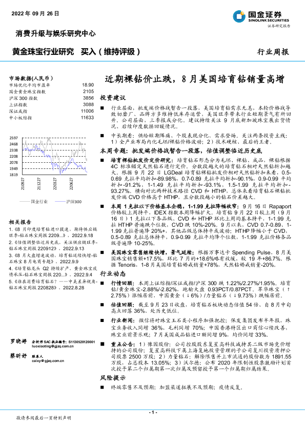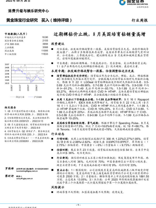 【国金证券】【20220926】20220926-国金证券-黄金珠宝行业研究:近期裸钻价止跌,8月美国培育钻销量高增-19页
