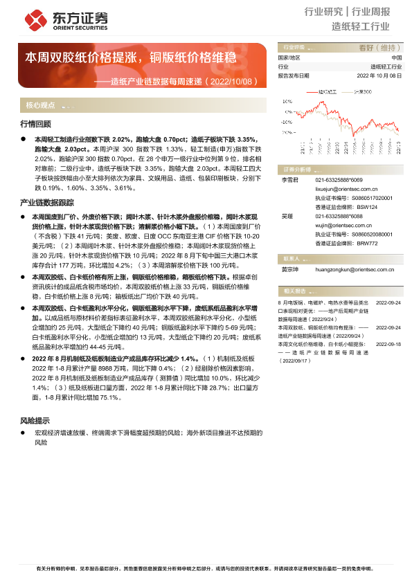 【东方证券】【20221008】20221008-东方证券-造纸产业链数据每周速递:本周双胶纸价格提涨,铜版纸价格维稳-13页