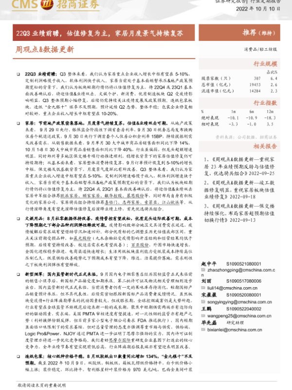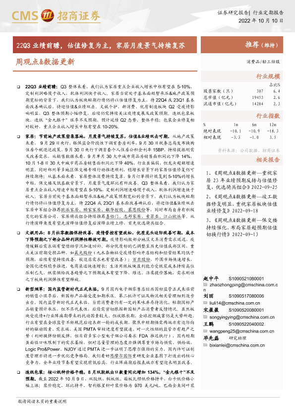 【海通证券】【20221010】消费品 轻工纺服周观点&数据更新:22Q3业绩前瞻,估值修复为主,家居月度景气持续复苏-21页