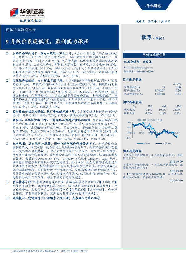 【华创证券】【20221016】20221016-华创证券-造纸行业跟踪报告:9月纸价表现低迷,盈利能力承压-16页