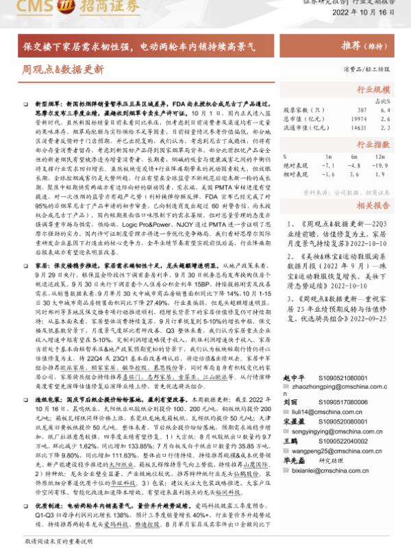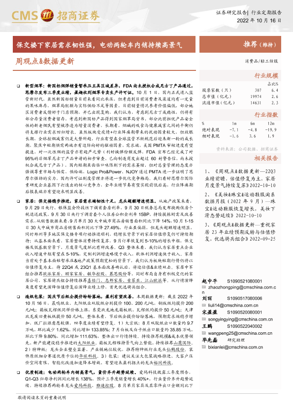 【海通证券】【20221016】轻工纺服周观点&数据更新:保交楼下家居需求韧性强,电动两轮车内销持续高景气-19页