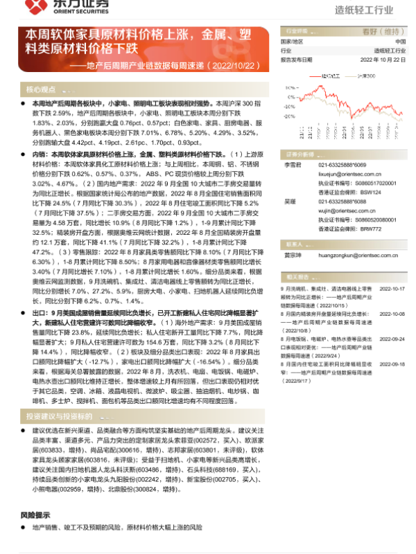 【东方证券】【20221022】20221022-东方证券-造纸轻工行业地产后周期产业链数据每周速递:本周软体家具原材料价格上涨,金属、塑料类原材料价格下跌-13页