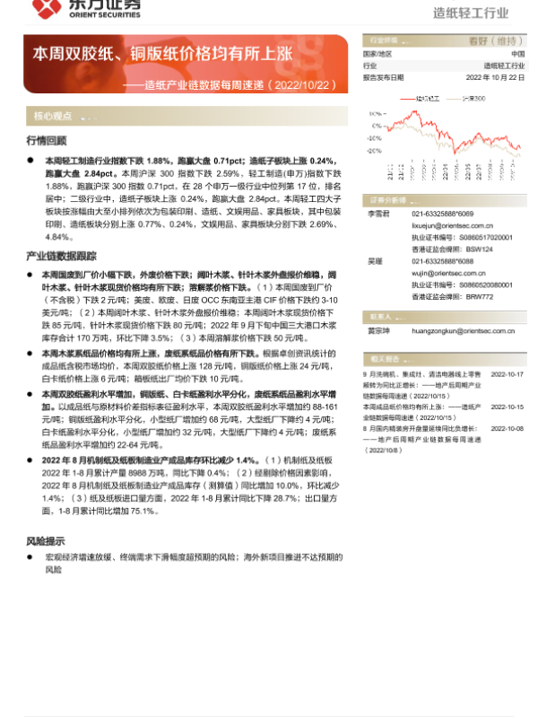 【东方证券】【20221022】20221022-东方证券-造纸产业链数据每周速递:本周双胶纸、铜版纸价格均有所上涨-13页