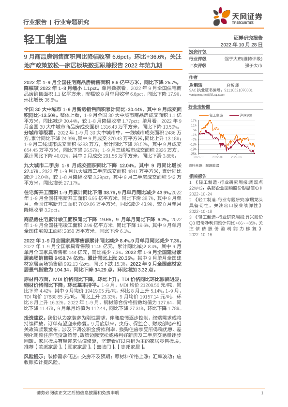 【天风证券】【20221028】家居板块数据跟踪报告2022年第九期:9月商品房销售面积同比降幅收窄6.6pct,环比+36.6%,关注地产政策放松-12页