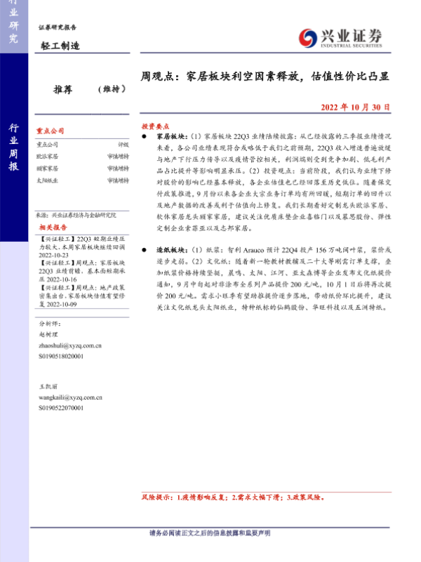 【兴业证券】【20221030】20221030-兴业证券-轻工制造周观点:家居板块利空因素释放,估值性价比凸显-22页