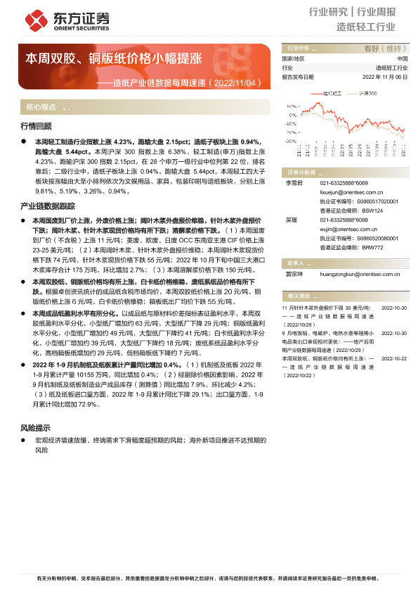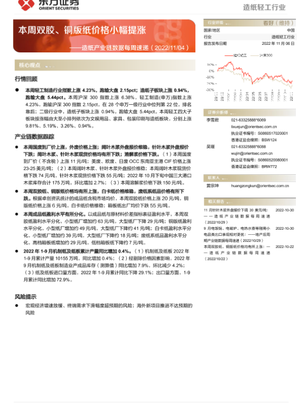 【东方证券】【20221106】20221106-东方证券-造纸产业链数据每周速递:本周双胶、铜版纸价格小幅提涨-13页