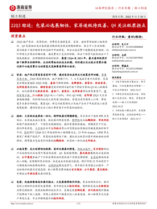 【浙商证券】【20221105】22Q3综述:包装必选展韧性,家居造纸待改善,Q4关注纸浆拐点-32页