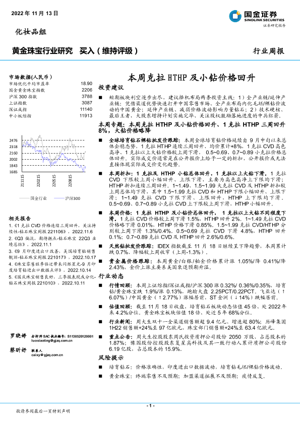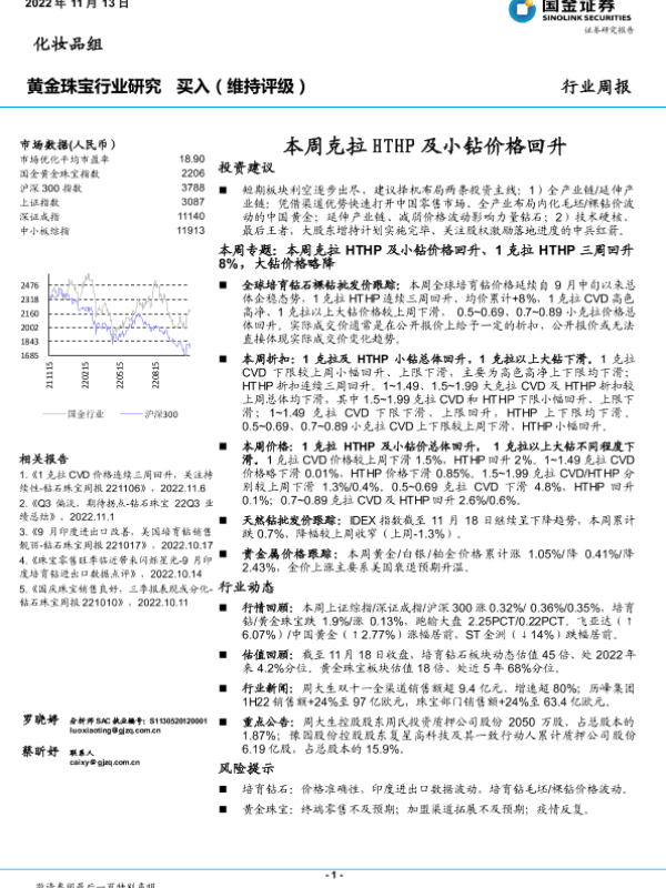 【国金证券】【20221113】20221113-国金证券-黄金珠宝行业周报:本周克拉HTHP及小钻价格回升-17页