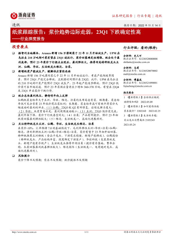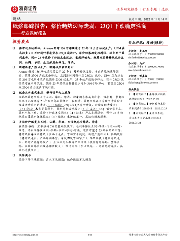 【浙商证券】【20221114】20221114-浙商证券-造纸行业深度报告:纸浆跟踪报告:浆价趋势边际走弱,23Q1下跌确定性高-11页