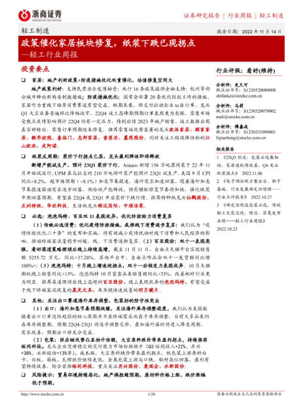 【浙商证券】【20221114】20221114-浙商证券-轻工行业周报:政策催化家居板块修复,纸浆下跌已现拐点-26页