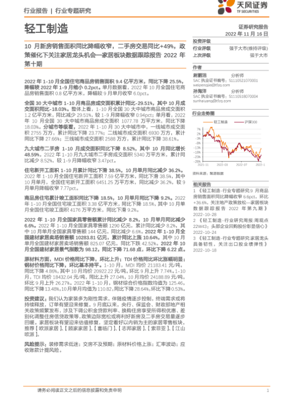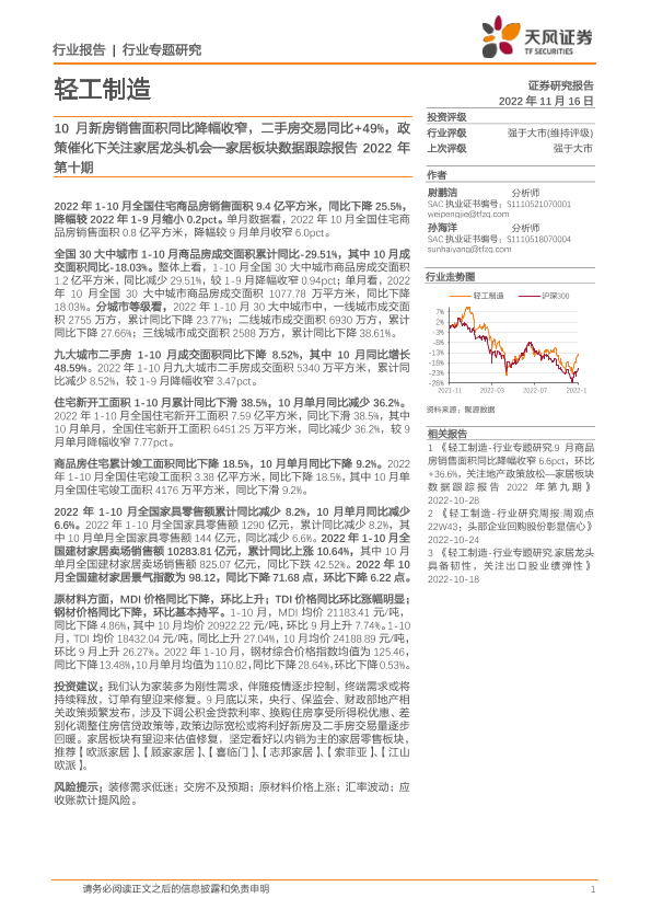 【天风证券】【20221116】家居板块数据跟踪报告2022年第十期:10月新房销售面积同比降幅收窄,二手房交易同比+49%,政策催化下关注家居龙头机会-13页