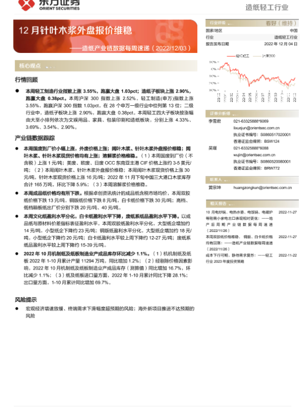 【东方证券】【20221204】20221204-东方证券-造纸产业链数据每周速递:12月针叶木浆外盘报价维稳-13页